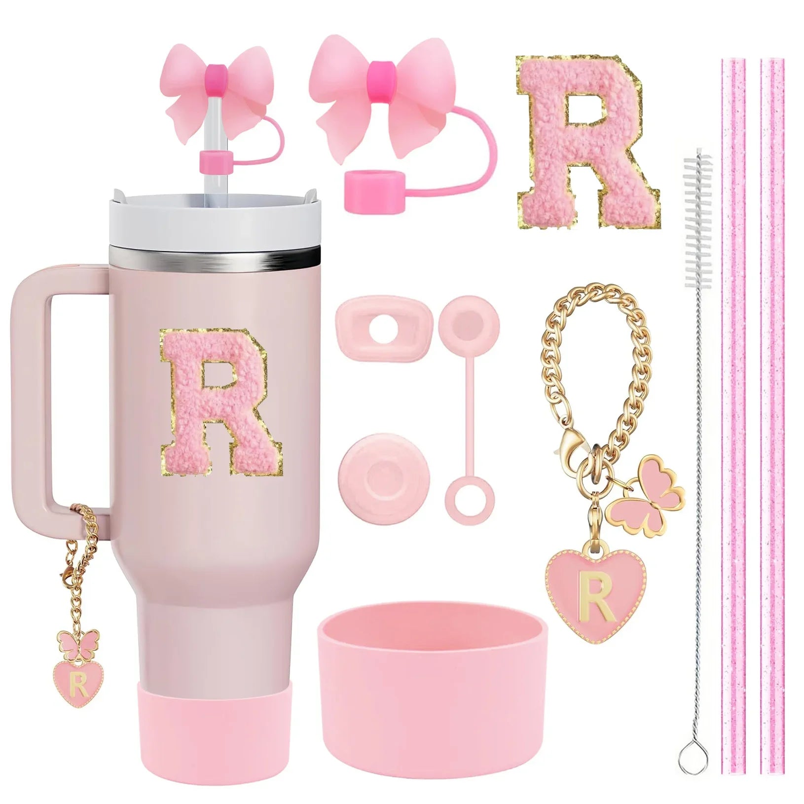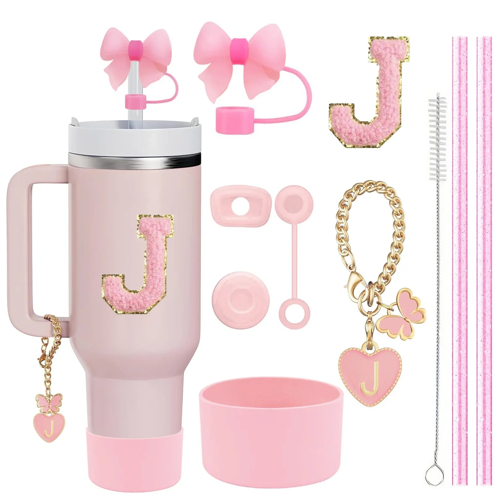 10PCS Accessories Set for Stanley Cup, 2 Straw and Brush and 1 Flower Charm Chain 3 Spill Proof Stopper Flowers Straw Cover Boot